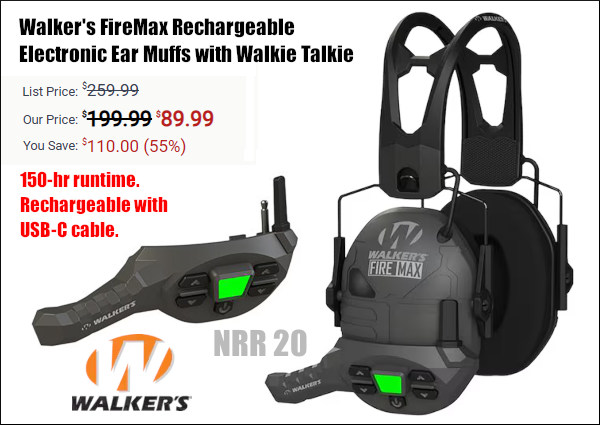 If you need to talk to your shooting buddies or hear range commands during matches, there are a variety of good electronic muffs on the market. Some of these even have “Walkie-Talkie” functionality so you can talk to team-mates or coaches at matches. We like these 2-way electronic muffs, but be aware that they offer much less max noise protection — typically in the NRR 20-22 range. Here is a good deal currently at MidwayUSA for Walker Electronic Muffs with Walkie-Talkie functionality. This NRR 20-rated unit has slim pads with removable microphone unit. It is now on sale at a 55% discount.
